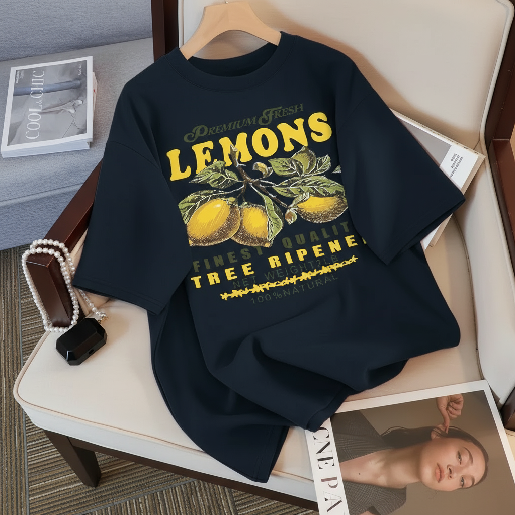 Step into your bright era with the Citrus Mood Tee. This statement piece captures the joy of summer through its vibrant lemon print and easy, relaxed fit. The soft, breathable fabric keeps you fresh while radiating positivity wherever you go. ✨ Pair it with white shorts and natural accessories for that sun-kissed, modern look.
